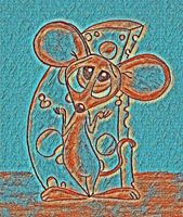 Een muisje met een blok kaas op de achtergrond getekend en deze digitaal bewerkt.