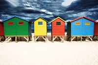 Fel gekleurde foto van de beroemde strandhuisjes op het strand van Muizenberg in Kaapstad, Zuid-Afrika. De donkere lucht versterkt de felle kleuren van de huisjes