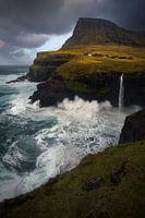 De Mulafossur waterval is de meest bekende op de Faroer eilanden, vanaf de kliffen heb je een prachtig uitzicht op de waterval en de mooie berg en dorp in de achtergrond.