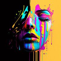 Een close-up van een gezicht, waarbij de gelaatstrekken nauwelijks herkenbaar waren onder de dikke verflagen. Levendige kleuren werden over het gezicht gegoten en gedruppeld, waardoor een chaotisch en abstract effect ontstond. De verf was zo aangebracht dat het leek alsof het smolt en over het gezicht vloeide, alsof de kleuren uit zichzelf leefden en bewogen. Het gezicht zelf was uitdrukkingsloos, alsof de geportretteerde erin berustte zich te laten overweldigen door de wervelende kleuren. Ondanks de chaos van de kleuren was er een gevoel van schoonheid en creativiteit in het schilderij, alsof de kunstenaar de verf gebruikte om de innerlijke werking van de geest van het onderwerp te onthullen.