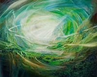 Dit olieverfschilderij opent een adembenemend en ongewoon tafereel dat de wetten van de fysica lijkt te tarten. Het schilderij is een viering van licht en de bochten ervan, met lichtstralen die van achter naar voren door bochten reizen, langs bizarre en grillige rotsen. De scène wordt doorkruist door een schilderachtige, kronkelende valleiweg met groene bomen, struiken en rotsen.