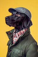 Een elegante Munsterlander, stijlvol gekleed met een modieuze hoed en een eenvoudige maar trendy outfit, straalt charisma uit. Zijn glanzende zwarte vacht en levendige, intelligente ogen trekken ieders aandacht. Tegen een felgele achtergrond is zijn charmante uitstraling een blikvanger - een echte traktatie voor elke hondenliefhebber!