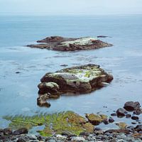 Kleine rots eilandjes voor de kust van Murlough Bay, County Antrim, Noord-Ierland. Het bovenste deel van de rotsen zijn begroeid met gele korstmossen.