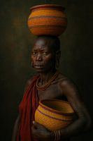 In een krachtig en intiem portret draagt een vrouw uit de Mursi-stam een met de hand gevlochten mand op haar hoofd, met een tweede stevig tegen haar lichaam geklemd. De rijke aardetinten, het diepe oogcontact en de traditionele sieraden brengen cultuur, waardigheid en historie tot leven.