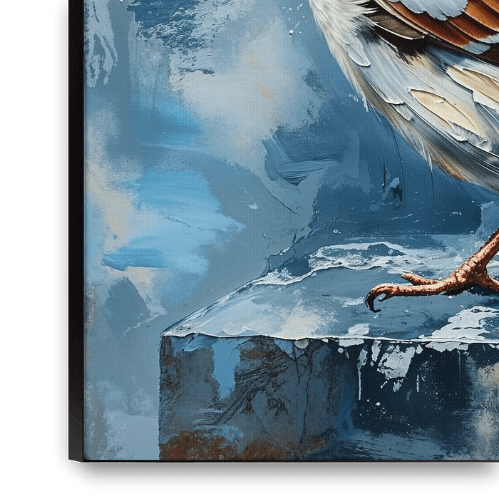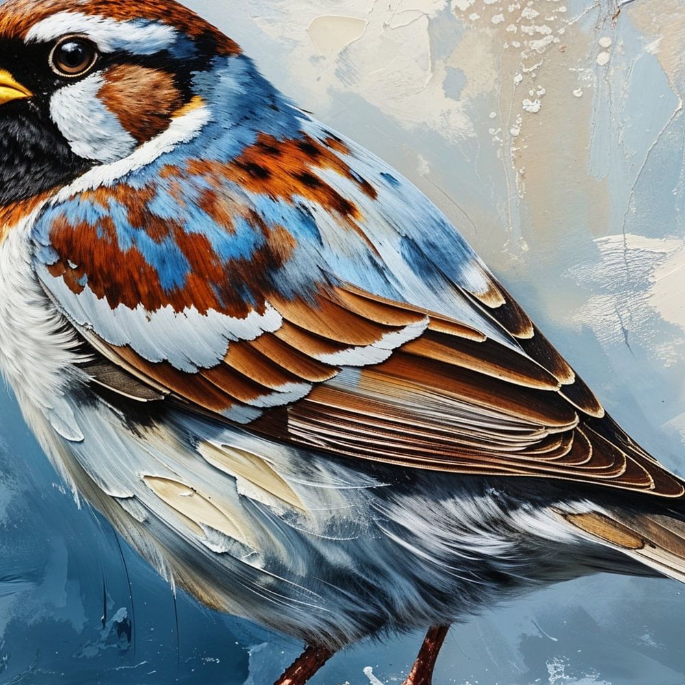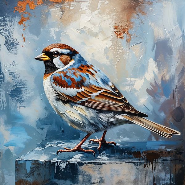 Een realistisch geschilderde mus vormt het stille middelpunt van dit werk. De gedetailleerde veren contrasteren prachtig met de expressieve, abstracte achtergrond, wat zorgt voor een krachtig en sfeervol beeld.