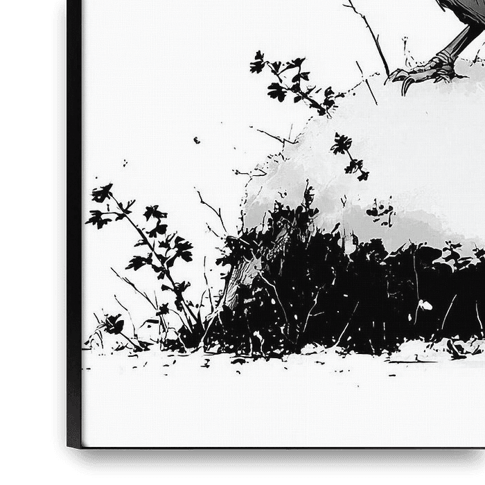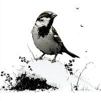 Deze karaktervolle kunstprint toont een mus die stoer op een kleine, besneeuwde heuvel staat. De vogel is gedetailleerd uitgewerkt in zwart, wit en enkele subtiele bruinaccenten op kop en vleugel. Zijn houding is alert, de borst licht naar voren en de blik gericht op iets buiten beeld, waardoor hij…