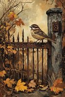 Dit prachtige schilderij toont een eenzame mus die rustig op een oude, roestige poort zit, omringd door vallende herfstbladeren. De warme kleuren en het gedetailleerde realisme brengen een gevoel van nostalgie en rust, perfect passend bij de sfeer van een rustige herfstdag. De zachte tinten van geel, bruin en oranje contrasteren mooi met het verweerde metaal van de poort en de grauwe lucht erachter. Ideaal voor wie houdt van natuur en dieren, en een stukje serene herfst wil toevoegen aan het interieur. Dit werk past prachtig in een klassiek of landelijk interieur, en brengt de schoonheid van de natuur naar binnen.