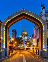 Doorkijk naar Muscat Street in Kampong Glam, de Arabische wijk in Singapore. Een levendige wijk vol gezellige restaurantjes. Hier zicht op de Sultan Mosque tijdens het blauwe uurtje in de vroege ochtend.