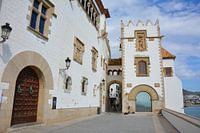 De prachtige poort en witte toren van Museu del Cau Ferrat in Sitges aan de Costa Dorada Spanje