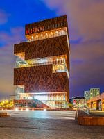 Museum aan de Stroom of MAS, door Neutelings Riedijk Architecten, in de voormalige Antwerpse havenwijk Het Eilandje bij nacht, Vlaanderen, België