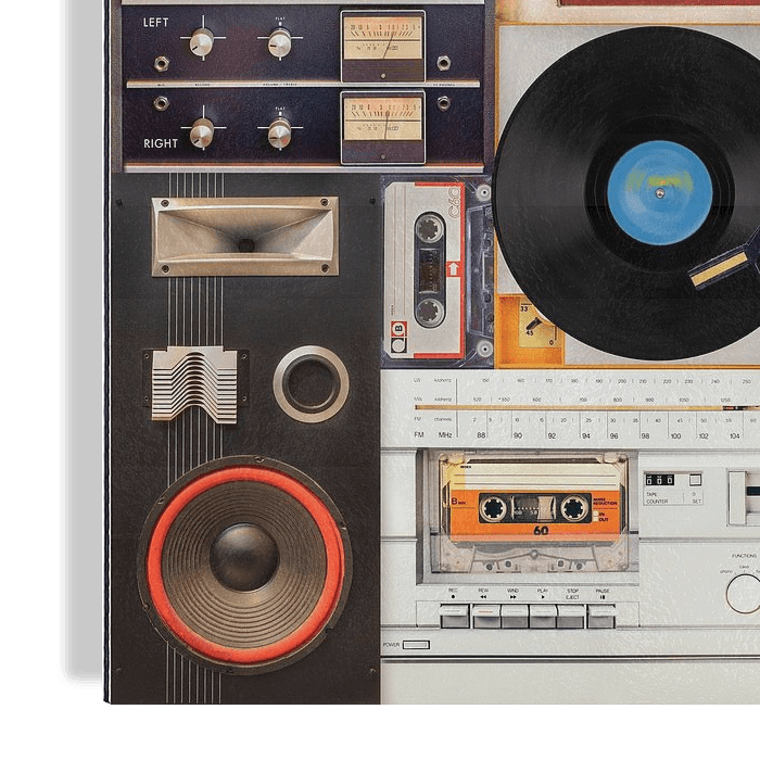 Collage van een serie vintage audio apparatuur uit de jaren zeventig en tachtig waaronder platenspelers, een oude bandrecorder, audiocassettes, cassettedeck en speakers