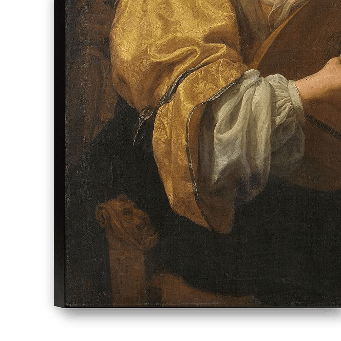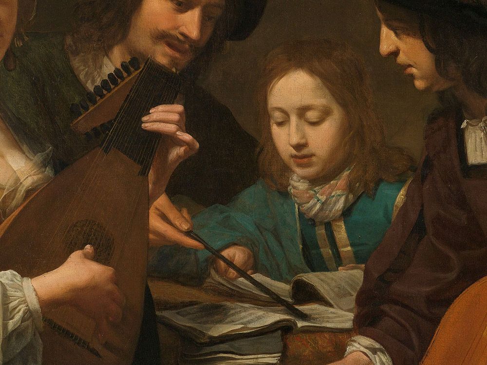 Musicerend gezelschap. Links een vrouw met een luit, rechts een man met een cello. Tussen deze twee aan een tafel geeft een man een jongen muziekles of zangles.