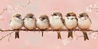 Een zachte lenteochtend lijkt te ademen in dit schilderij, waarin vijf kleine, fluffy bruine musjes zich dicht tegen elkaar aan verzamelen op een delicate kersenbloesemtak. De musjes, met hun pluizige veren en nieuwsgierige oogjes, vormen een speels en schattig tafereel, als kleine, levendige vlekjes van warmte in een rustgevende, natuurlijke setting. Hun lichte bruine en beige tinten contrasteren subtiel met de zachte pasteltinten van hun omgeving, en brengen een gevoel van harmonie en vreugde.