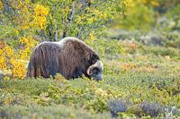 Een muskusos in Noorwegen in het natuurgebied Dovrefjell. De herfstkleuren zijn duidelijk zichtbaar en deze als oerdieren uitziende beesten maken zich op voor d koude winter die eraan komt.