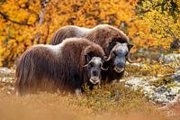 Een muskusos in Noorwegen in het natuurgebied Dovrefjell. De herfstkleuren zijn duidelijk zichtbaar en deze als oerdieren uitziende beesten maken zich op voor d koude winter die eraan komt.