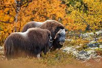 Een muskusos in Noorwegen in het natuurgebied Dovrefjell. De herfstkleuren zijn duidelijk zichtbaar en deze als oerdieren uitziende beesten maken zich op voor d koude winter die eraan komt.