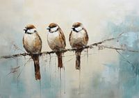 Mussen | Natuurlijke Dierenkunst - Op een rustgevende achtergrond van zachte beiges en koelere blauwtinten, poseren drie bedachtzame mussen op een tak, harmonieus vastgelegd in een sfeer van serene stilte. De textuurrijke afwerking en de vloeiende vormen versterken de organische elegantie, waardoor dit stuk een subtiele, natuurlijke uitstraling heeft die in menig interieur kan ademen.