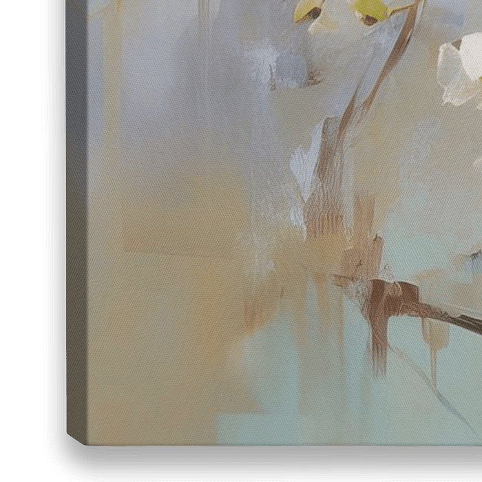 Mussen op Lentebloesem - Dit schilderij vangt een idyllisch moment met twee mussen op een tak, omhuld door zachte lentebloesems. Het gebruik van subtiele aquarel-achtige blauwtinten contrasteert fraai met de warme bruinen en tans van de vogels en tak, terwijl het wit van de bloemen een fris accent brengt in deze natuurlijke…