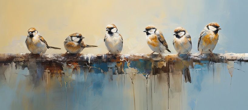 Mussen op Tak | Vogel Schilderij - Dit charmante tafereel van vijf rustende mussen op een tak ademt een serene sfeer uit, waarbij de warme beige en koelere blauwe achtergrond prachtig samenvloeien met de natuurlijk ogende bruin-en geeltinten van de vogels. De speelse penseelstreken en de subtiele textuur voegen een levendige dynamiek toe, zonder de kalme uitstraling te verstoren.