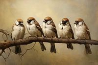 Mussen - Dit realistische kunstwerk straalt een serene rust uit met vijf geschilderde mussen die ontspannen op een tak rusten. De warme bruintinten en het subtiele kleurgebruik benadrukken de natuurlijke setting, terwijl de fijne details van de veren het werk een zachte textuur geven die in elk interieur een vleugje natuurlijke harmonie…