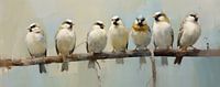 Mussen - Dit serene schilderij toont een rij van zeven kleine vogels op een tak, waarschijnlijk mussen, uitgevoerd in subtiele aardetinten met zachte witte en crèmekleurige veren, doorspekt met accenten van warm geel en bruin. Het kunstwerk heeft een kalme, rustieke charme, met een vleugje levendigheid door de geelachtige borstveren van…