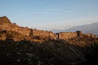 Muur op een heuvel wordt verlicht door de warme kleuren van de zonsopkomst. Een groep duiven vliegt over de muur. De muur is gelegen in een van de oudste steden van Albanië, namelijk Gjirokaster. Een cultureel centrum.