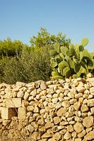 de lichtoranje kleur van de cactusfruit springt in het oog. Door de verschillende texturen in deze foto worden de lijnen zachter.