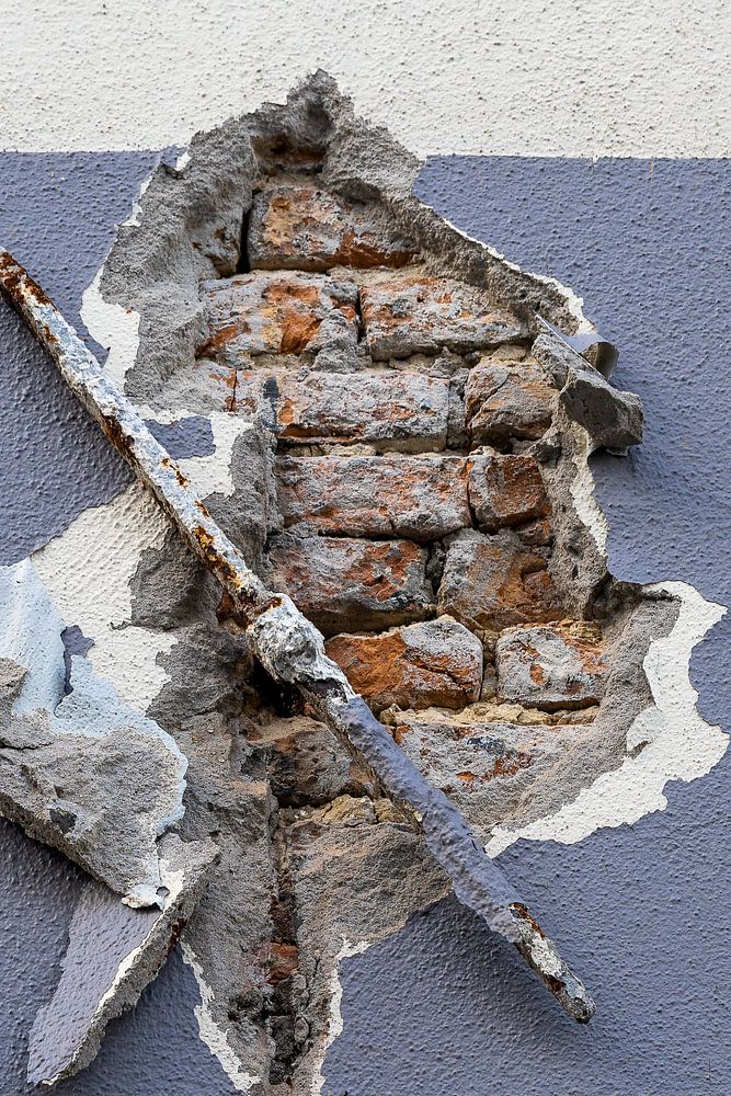 Valt dit gebouw uit elkaar? Zal de vloer nog te belopen zijn? Aan de zijkant van dit historische winkelpand in Bergen op Zoom verraadt het anker dat uit de muur komt zetten de leeftijd van het pand. Hoe netjes het stucwerk ook is, het gebouw wil zich toch laten zien. De warme, oranje baksteen vormt een mooi contrast met het koude blauw.