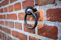Antieke muurring of ankerring om paarden aan vast te zetten, aan de muur van een 19e eeuwse boerderij.
