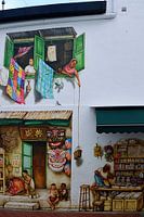 Prachtige muurschilderingen op Mohamed Ali Lane in Chinatown in Singapore, Azië. Ze geven een eigenzinnig beeld van Singapore's straatverkopers uit de beginjaren van de onafhankelijkheid in de jaren 1960's.