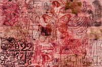 Muze, collage op hout. Muze of inspiratie voor de kunstenaar. Op een ondergrond van hout vele krabbels, tekens en tekeningen die de muze verbeelden. De muze staat voor inspiratiebron. Rood tinten. Er is veel te zien als je deze afbeelding groter bekijkt.