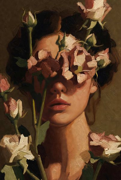 Elegant vrouwenportret omringd door bloeiende bloemen, zacht natuurlijk licht dat delicate gelaatstrekken benadrukt, serene uitdrukking, romantische stemming, perfect voor schoonheid, mode en artistieke concepten.