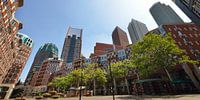 Muzenplein in Den Haag met torens van de ministeries in de achtergrond. Kleurrijk en modern Panorama met kikkerperspectief, moderne archtectuur