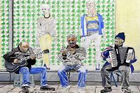 Muzikanten uit oosteuropa voor een etalage van een modewinkel op het Damrak.