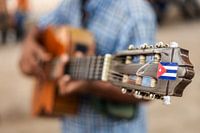 Een man maakt muziek op de straten van Havana, Cuba. Afgebeeld is een akoestische gitaar.