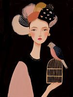 Met een blik die zegt: "ik weet iets wat jij niet weet", poseert deze stijlvolle dame met een vogel die weigert zich te laten kooien. Haar extravagante hoofddeksel – een feest van vormen, patronen en pastelkleuren – lijkt rechtstreeks uit een droomwereld te komen. Het werk speelt op humorvolle wijze met thema’s als vrijheid, schoonheid…