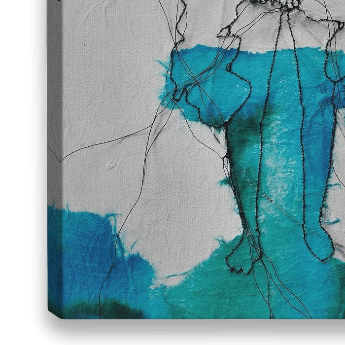 Een figuratief werk van zwart draad & waterverf op rijstpapier. Dit is een veelvoorkomende afbeelding van Kim, het meisje is krachtig & kwetsbaar tegelijkertijd. De losse draden staan voor verandering, groei & beweging.