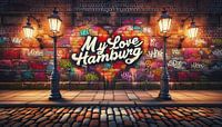 De afbeelding toont een levendige, verlichte graffitimuur bij nacht met de woorden "My Love Hamburg". De digitale graffiti is kleurrijk en bedekt het hele muuroppervlak met verschillende tags en artistieke expressies. Voor de muur loopt een geplaveid pad. Twee klassieke straatlantaarns staan aan weerszijden van de foto en verlichten het…