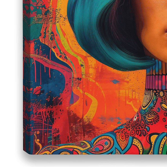 Een opvallend portret van een vrouw met levendige, contrasterende oogschaduw en een tweekleurige bob. De achtergrond is een abstracte explosie van warme kleuren met wervelende texturen die de uitstraling van het onderwerp aanvullen. De belichting benadrukt haar gelaatstrekken en de rijke kleuren van haar haar en make-up, wat een gevoel…