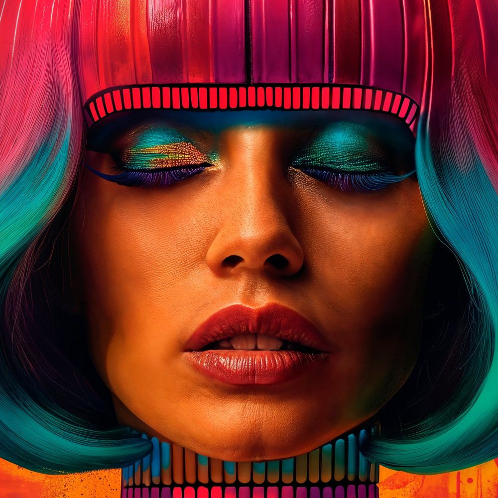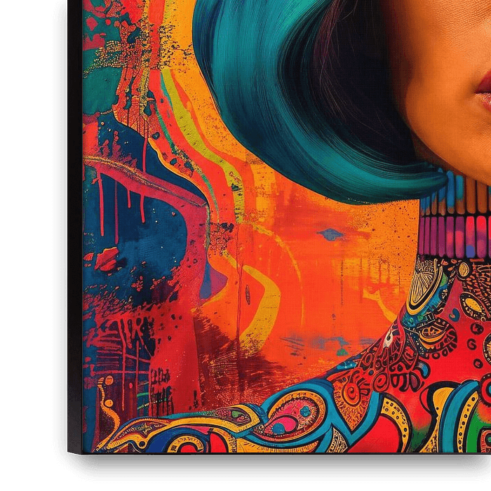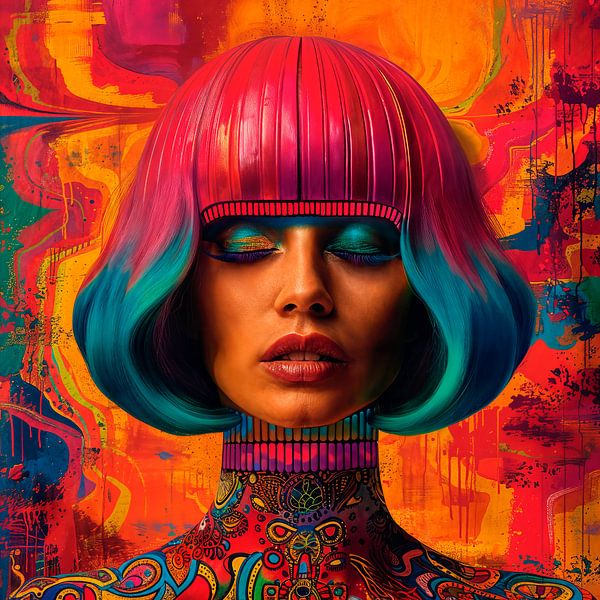Een opvallend portret van een vrouw met levendige, contrasterende oogschaduw en een tweekleurige bob. De achtergrond is een abstracte explosie van warme kleuren met wervelende texturen die de uitstraling van het onderwerp aanvullen. De belichting benadrukt haar gelaatstrekken en de rijke kleuren van haar haar en make-up, wat een gevoel…