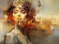 In dit betoverende schilderij wordt een vrouw afgebeeld die lijkt op te doemen uit een dromerige, abstracte wereld. Haar zachte, golvende haar vloeit samen met een mozaïek van warme kleuren — koper, goud en oker — die in een bijna architectonisch patroon over het doek zijn uitgesmeerd. Haar blik is sereen en krachtig tegelijk, met een vleugje melancholie. De fijne details van haar halskraag en de elegante lijnen van haar schouders contrasteren prachtig met de ruwe, impressionistische achtergrond. Alles lijkt te vervagen in een spel van licht, schaduw en structuur, waardoor het portret zweeft tussen realisme en abstractie, als een herinnering die langzaam vervliegt in de tijd.