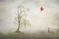 Op zijn achterpoten kijkt het hondje omhoog naar de hartvormige ballon die door de winterlucht zweeft.. Wie is hem kwijtgeraakt? Het moet een gebaar van liefde zijn geweest. In het mistige weiland staat de kale boom met zijn hangende takken, stil en wachtend, terwijl de kou het moment omhult.