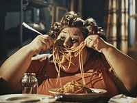 My love for Spaghetti. Humoristisch portret van een spaghetti etende vrouw. Een leuke en bijzondere blikvanger voor je interieur!