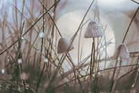 Mycena paddenstoeltjes in het laatste zonlicht. De waterdruppeltjes weerkaatsen in het zonlicht en geven mooie bokehbolletjes.