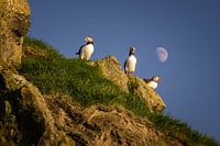 Drie papegaaiduikers op Mykines eiland met maan op achtergrond, Faeröer
