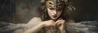 Mysterie in Goud | Portret Goudtinten - Hier zien we een gedetailleerd, bijna fotorealistisch portret van een vrouw met een versierd masker dat een vleugje Venetiaanse flair toevoegt. De kunstenaar speelt meesterlijk met schaduw en licht, waarbij de rijke goudtinten van het masker en subtiele accenten van zilver en parels uitkomen tegen een mysterieus donkere achtergrond. De sluierige stof om haar schouders verzacht de compositie, terwijl het masker een geheimzinnige dimensie toevoegt, die ons doet nadenken over wat er schuilgaat achter de façade die we aan de wereld presenteren.