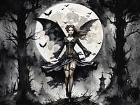 Tijdens volle maan land er een vrouw, half vleermuis, op het kerkhof in het bos. Vleermuizen vliegen met haar mee in de nacht. Het beeld is met behulp van ai gegenereerd.