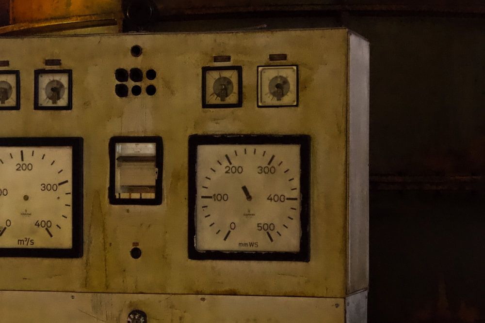 Mysterieus verlicht hoekje in C-Mine (Genk, België). Machinekast met radertjes voor een koperen installatie. Industrieel plaatje.