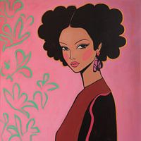Haar kleding, een mix van rood en zwart, voegt een dramatisch contrast toe tegen de zachte, roze achtergrond. Het ontwerp van haar jurk – een combinatie van rijke, gedempte tinten – lijkt te vloeien met de omgeving, terwijl de subtiele suggestie van bladeren aan de linkerzijde van de achtergrond een natuurlijk element toevoegt dat het mysterieuze karakter van het beeld verder versterkt. De bladeren lijken bijna te bewegen, te ruisen, wat de suggestie wekt van een verborgen verhaal of een geheime wereld.