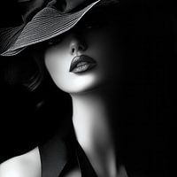Deze visueel sterke afbeelding laat een vrouw zien in een sjieke zwarte sjaal en een hoed als een sluier, wat haar een verleidelijke en krachtige aanwezigheid geeft.
